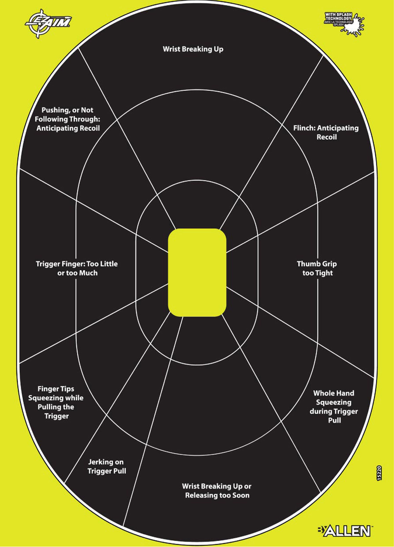 These Allen EZ Aim Splash reactive paper targets feature a 12.5" x 18" size with black and chartreuse coloring for high visibility at the range. The 30-pack hanging design is suitable for handgun training and practice. The splash reactive design provides immediate visual feedback upon bullet impact.