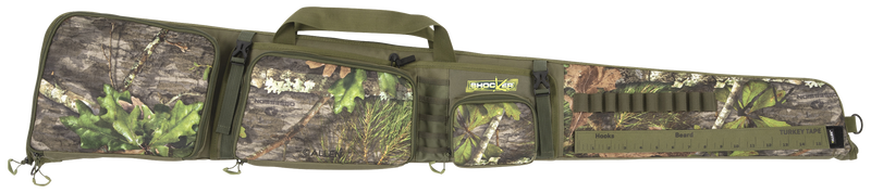 The Shocker is a purpose-built shotgun case designed to accommodate shotguns up to 52 inches in length, featuring Mossy Oak Obsession camouflage accents. It includes foam padding, oversized zippers, lockable security, and integrated storage for turkey hunting accessories such as strikers, calls, choke tubes, and spurs.