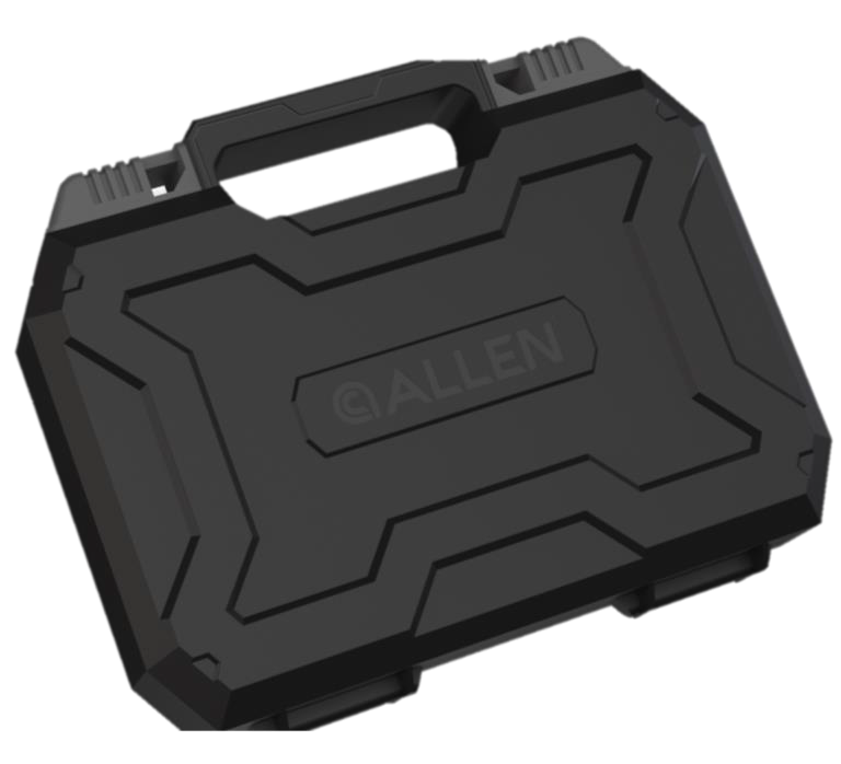 This hardshell handgun case by Allen Company features a rigid polymer shell with soft egg crate foam interior, designed to accommodate most pistols and revolvers up to 9 inches in overall length. The lockable case includes a built-in carry handle for easy transport and is suitable for range trips, travel, or secure home storage.