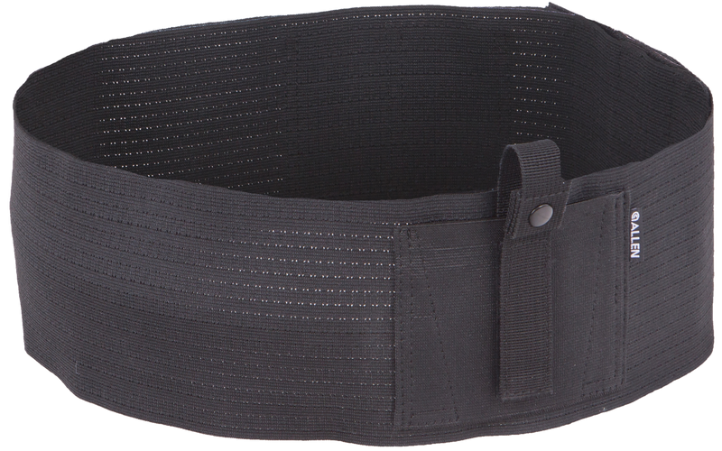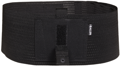 The Allen Hideout is an adjustable belly band holster designed for concealed carry that fits waist sizes 46"-60" (XL-3XL). It features elastic and nylon construction with dual-layer pockets, two magazine pockets, and an adjustable strap, and is ambidextrous for both right and left-handed users. The breathable, ventilated design accommodates most concealed carry handguns and supports cross-draw positioning.