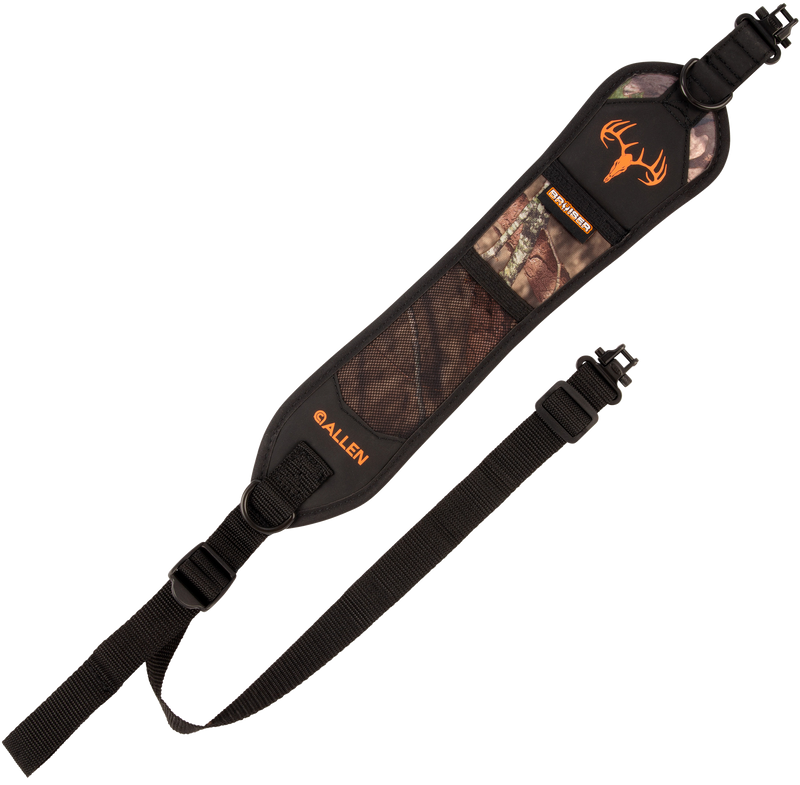 The Hypa-Lite Bruiser is an adjustable rifle sling constructed from ultra-durable hypalon with molded low-density foam and non-slip backing, designed for whitetail deer hunting. The sling features Mossy Oak Break-Up Country camouflage, measures 3.25" wide with a 21"-40" adjustable length, and includes a stretch mesh pocket for windicators or calls plus a neoprene pocket for accessories. Swivels are included for secure firearm attachment.