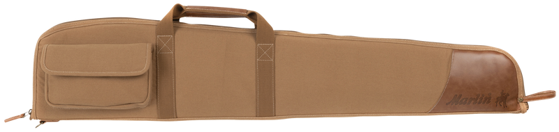 This 42-inch rifle case is designed to fit Marlin lever-action rifles and features a durable cotton canvas exterior with a faux leather nose accent for classic styling. The case includes a large gusseted flap pocket for accessories and a lockable design for security. Interior dimensions are 41" length x 9.5" width x 1.5" height.