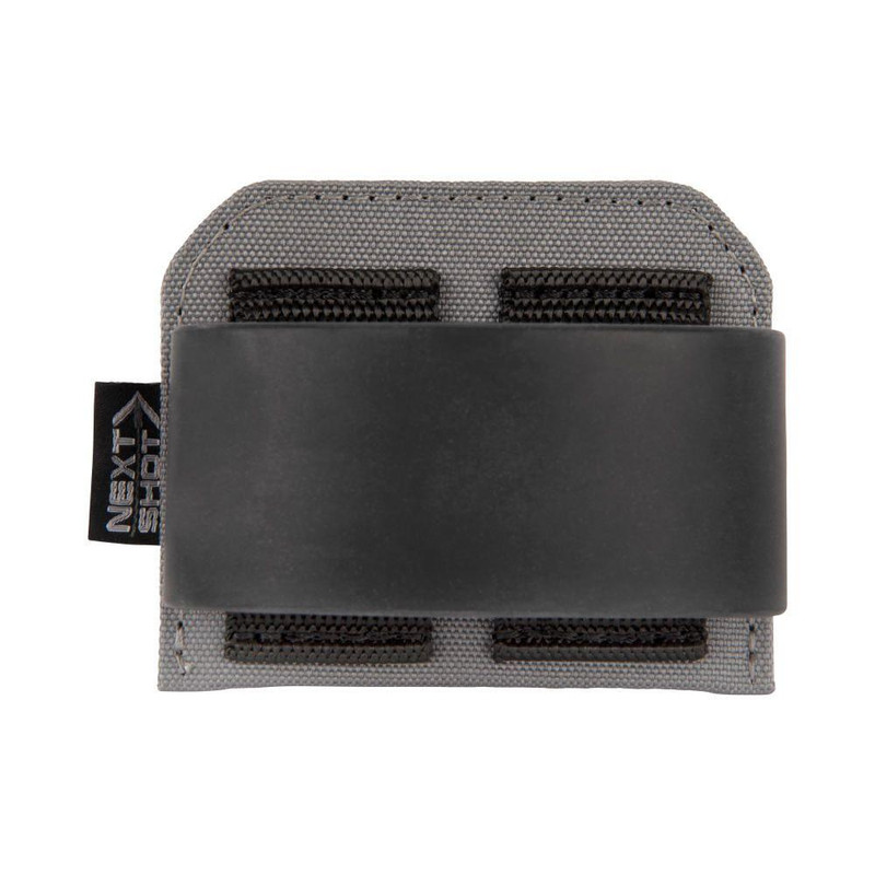 The Next Shot Shotgun Shell Band is a silicone carrier designed to hold up to three 12-gauge shotgun shells and attaches to most firearm buttstock sizes. The flexible silicone construction prevents damage to the firearm during attachment and removal. The carrier features elastic cartridge loops sized to accommodate 20-gauge through 12-gauge shotgun shells.