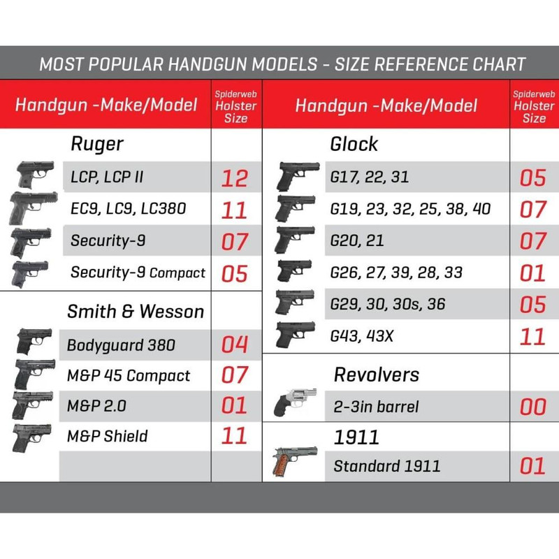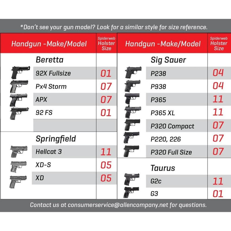 The Allen Spiderweb is an in-the-pocket conceal carry holster featuring a raised web-grip pattern for secure pocket retention and a slick lining for quick, easy draws. It is ambidextrous, designed for both right and left-handed shooters, and fits multiple popular firearm models including the Ruger SR9C and Glock 27.