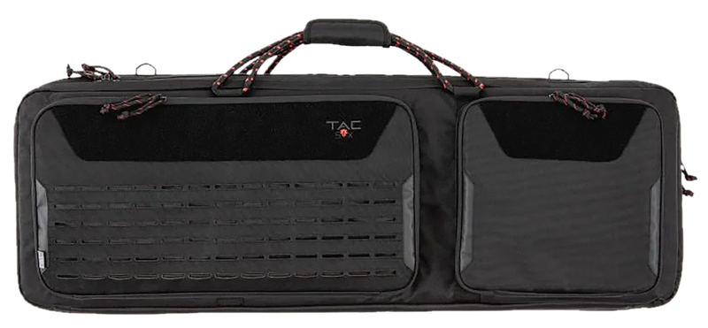 The Tac Six Unit is a 2-rifle tactical case constructed from durable 600D polyester with all-weather protection. It features padded interior, double zippers, and lockable hardware for secure transport and storage of rifles. Dimensions are 40.5" L x 15.8" W x 4.1" H.