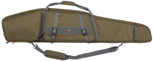 The Tac Six Unit is a 55-56 inch tactical case designed to hold 2 rifles with protective padding and durable 600D polyester construction. Features include double zippers, lockable hardware, and weather-resistant materials suitable for field use and storage.