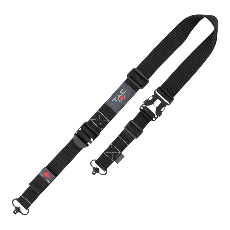 The Tac Six Citadel is a double point rifle sling featuring quick detach (QD) attachments for secure firearm mounting. Constructed from black webbing with a width of 3.8 inches, it provides adjustable length positioning for tactical and hunting applications.