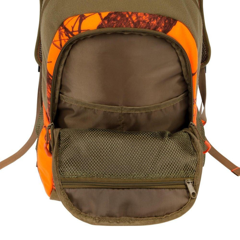 The Terrain Delta is a daypack featuring Mossy Oak Break-Up Blaze camouflage with two large zippered compartments and multiple organizer pockets for gear storage. Padded shoulder straps and brushed tricot construction provide comfort and quiet field performance. Dimensions are 12.5" x 4" x 18" with vertical accessory and dual side mesh pockets.
