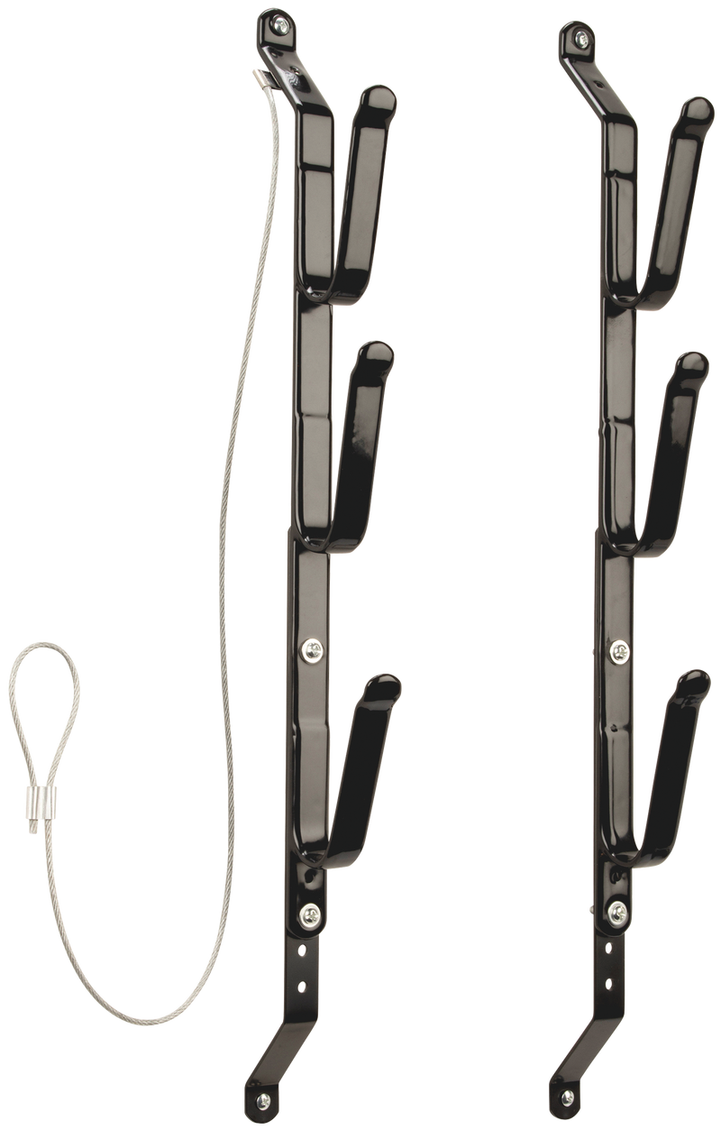 A steel gun rack designed to mount over windows from 18" to 26" wide, featuring a plastisol coating to protect firearms and tools from scratching. Includes a plastic-coated steel cable for securing guns and adjustable steel clips that can be flexed for more secure holding of various items.