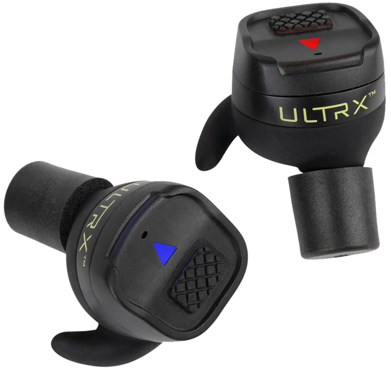 Electronic hearing protection earbuds with 26 dB NRR and Bluetooth connectivity for situational awareness. Features .001ms sound response time, sound wave compression technology, and three environmental modes to adapt to different shooting conditions. Includes rechargeable charging case and voice synthesis acoustics.