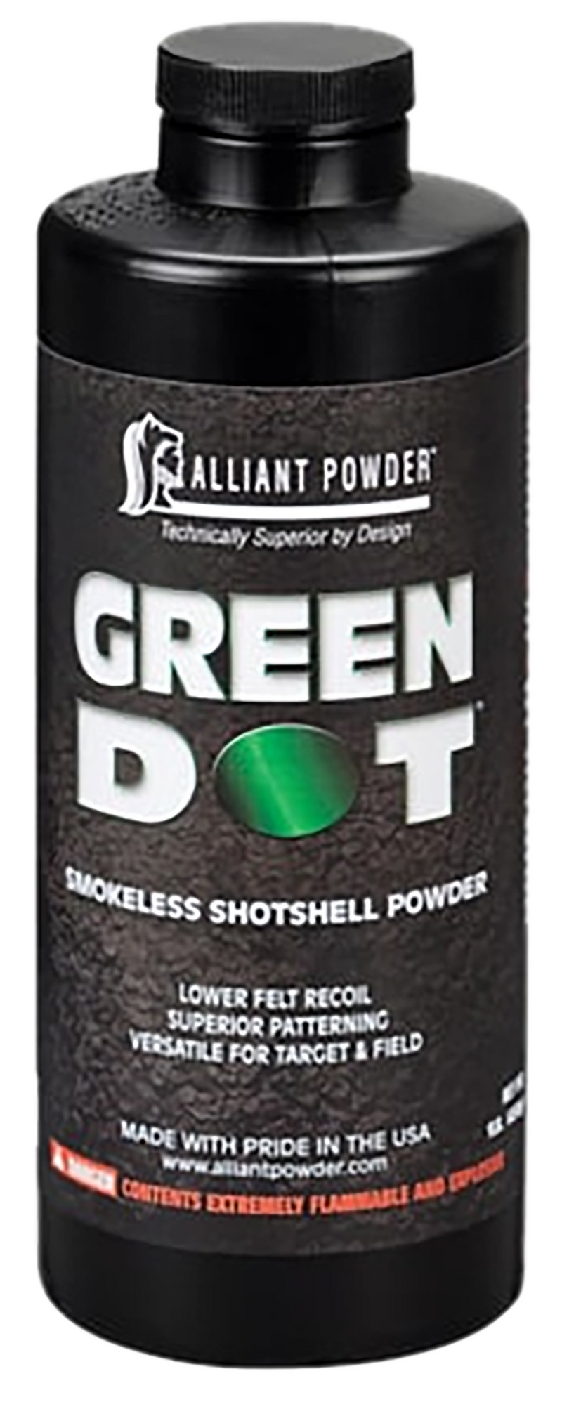 Alliant Green Dot is a smokeless shotshell powder designed for shotguns across multiple gauges, delivering a clean burn rate with reduced recoil and tight, uniform shot patterns. It is commonly used for target loads in 20 and 28 gauge applications and is noted as an excellent choice for both clay target shooting and field hunting. The powder is manufactured to strict standards for consistency and accuracy.