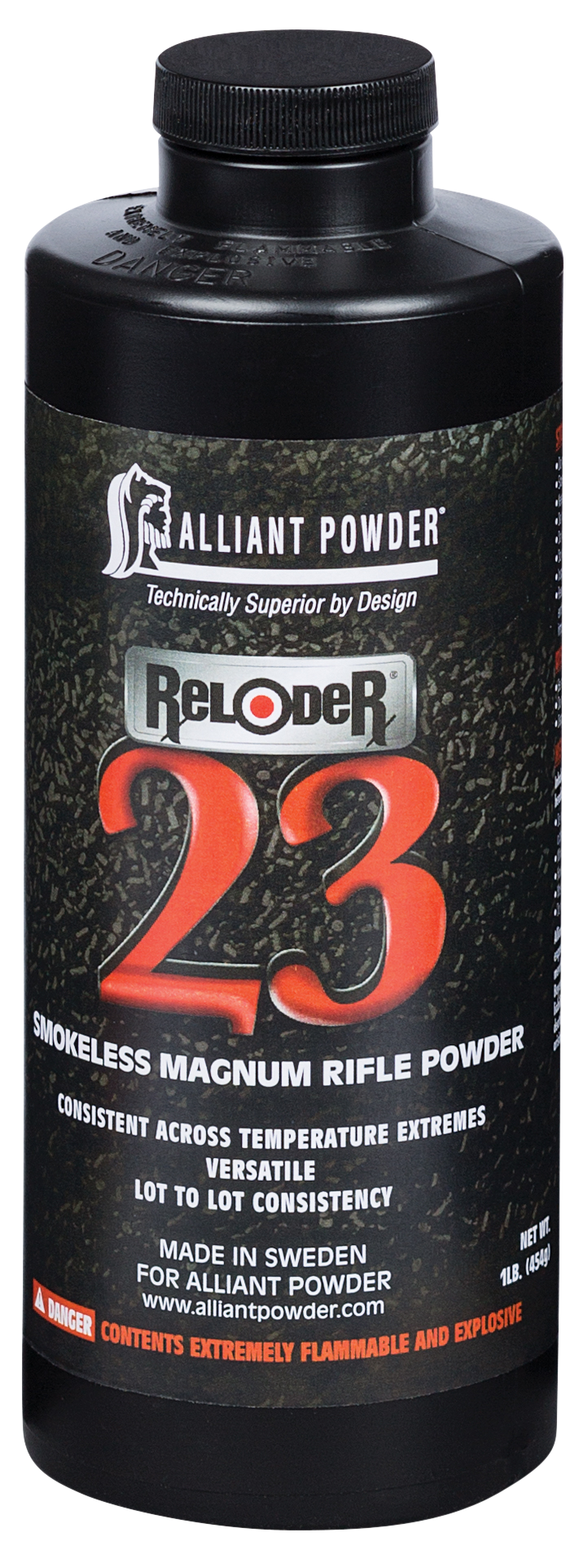 Alliant Reloder 23 is a magnum rifle powder designed for consistent performance across temperature extremes, utilizing TZ technology to resist pressure variations in hot and cold conditions. Suitable for long-range target shooting and magnum rifle applications across multiple calibers. Supplied in 1 lb containers.