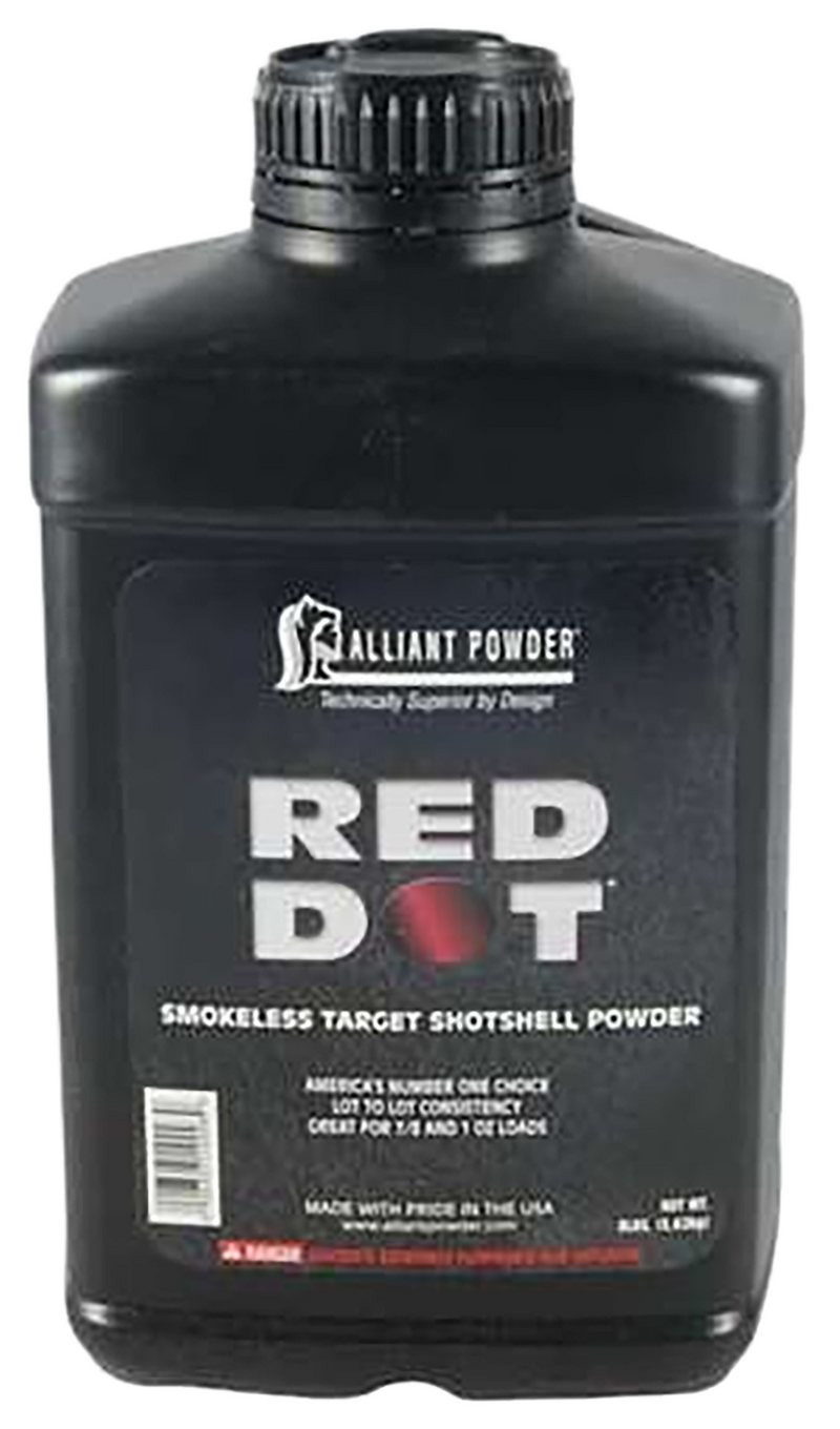 Alliant Red Dot is a smokeless powder designed for light and standard 12 gauge target shotshell loads, with a formulation that is now 50 percent cleaner burning. The powder offers lot-to-lot consistency and economical performance, making it a popular choice for clay target shooting since 1932. Secondary uses include handgun reloading applications.