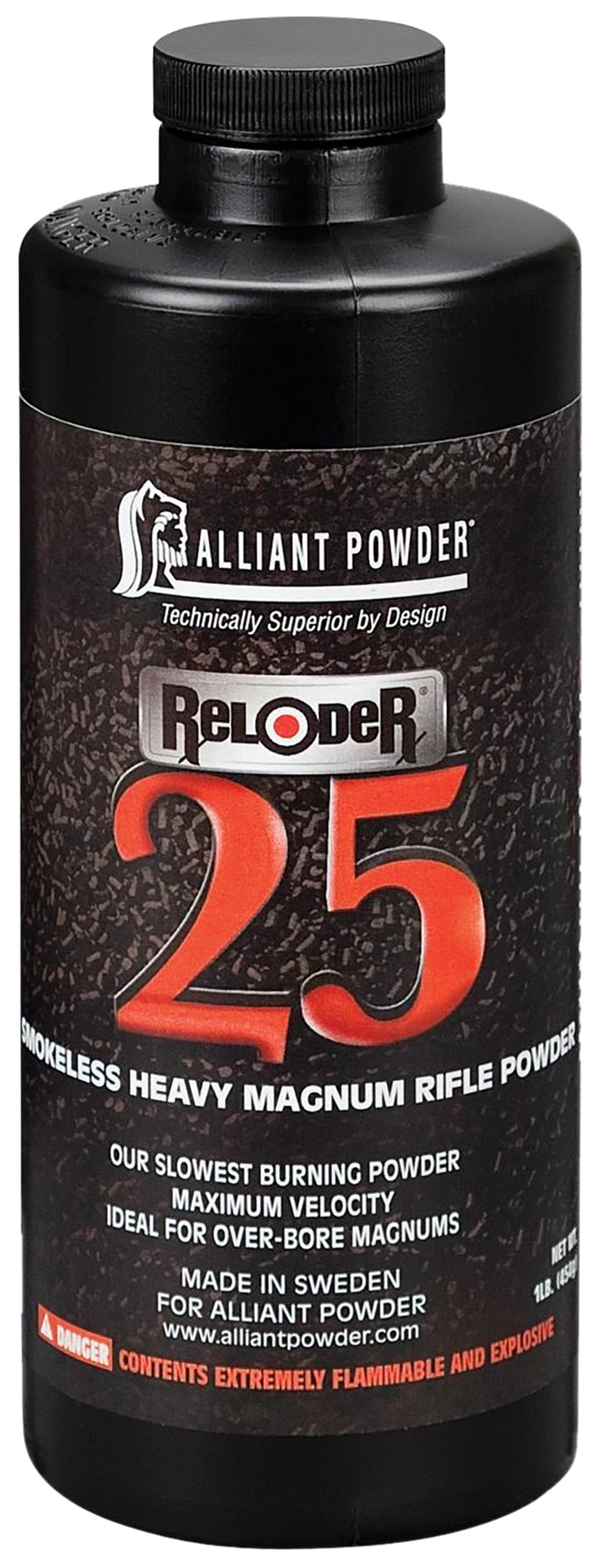 Alliant Reloder 25 is a slow-burning rifle powder designed for magnum rifle cartridges, capable of producing maximum velocity in heavy magnum loads. Ideal for big game hunting and Weatherby magnum applications, this powder delivers the extreme energy required for high-performance magnum ammunition. Packaged in a 1 lb can, it is manufactured by Alliant, a U.S.-based company with over 100 years of industry experience.