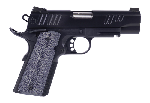 Semi-automatic 1911-style handgun chambered in 9mm Luger with a 5" barrel and 10+1 round capacity. Features a serrated slide, G10 grips, extended beavertail, Picatinny rail, and Novak sights. Black QPQ stainless steel construction with forged components, Made in Georgia.