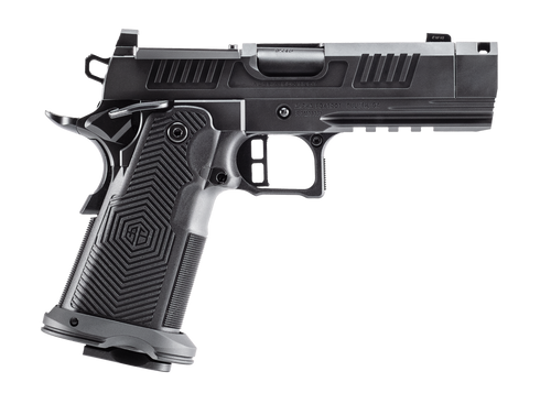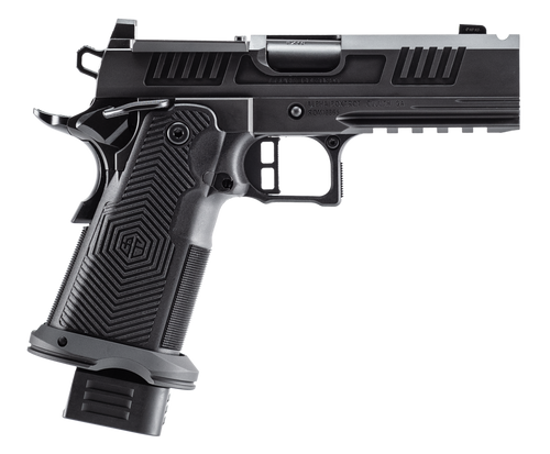 The AF1911-Romulus is a 9mm semi-automatic pistol with a 4.25" compensated threaded barrel and optic-ready MOS cut for red dot integration. It features SUS416 stainless steel construction with DLC finish, night sights, polymer grips, and includes both 17rd and 20rd magazines. Built for tactical competition and defensive applications with superior accuracy and recoil control.