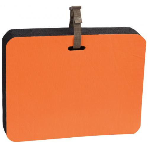 A 3-inch thick cushioned seat pad designed to add comfort to hunting chairs, stools, or stands. Features a coyote brown top fabric with blaze orange bottom, dimensions of 15.5" W x 12" L, and weighs 1.2 lbs with an easy-to-carry handle for portability.