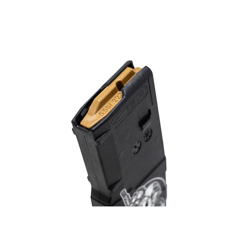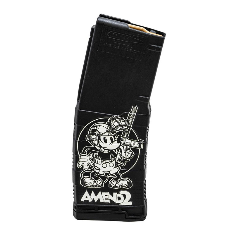 This Amend2 Mod-3 AR-15 magazine is chambered in 5.56 NATO/.223 Remington with a 30-round capacity and fits all AR-15/M16 pattern rifles. Constructed from impact-resistant polymer with a textured grip and featuring a 4-way anti-tilt self-lubricating follower for reliable feeding and durability. The magazine includes custom Steamboat Willie design printing and is California Proposition 65 compliant.