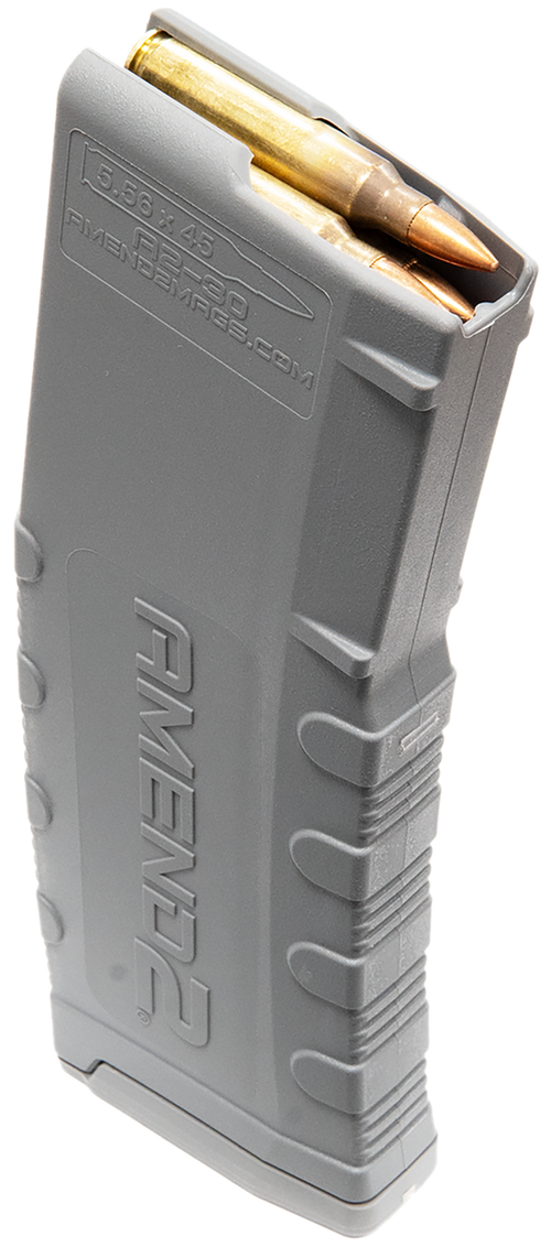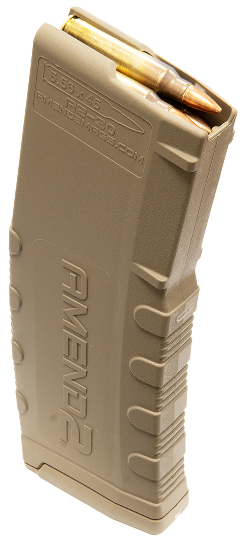 The Amend2 MOD-2 is a 30-round polymer magazine chambered in 5.56 NATO/.223 Remington, compatible with AR-15, M16, and M4 platforms. It features impact-resistant polymer construction with a textured grip, anti-tilt super follower, and heavy-duty stainless steel spring. Made in the USA as a durable, lightweight alternative to standard USGI aluminum magazines.