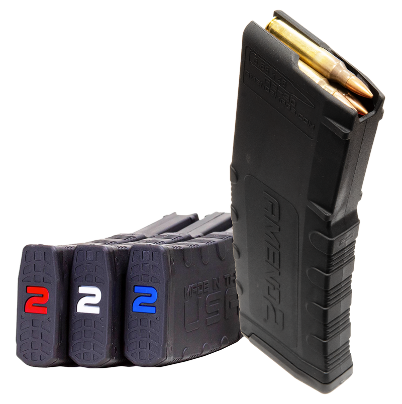 The Amend2 MOD-2 is a 30-round 5.56 NATO/.223 Remington magazine designed for AR-15/M4/M16 platforms, constructed from durable advanced polymer material. Features include a 4-way tilt super follower, heavy-duty industrial spring, and distinctive red, white, and blue internals for easy identification.