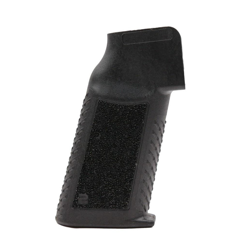 The Amend2 PG-E2 is an AR-15/AR-10 compatible pistol grip featuring a steep 17-degree grip angle, aggressive textured finish, and slim profile for enhanced weapon control and faster handling. The beavertailless design improves shooter comfort during extended use and offers broader firearm compatibility. Made in the USA from durable polymer with a lifetime manufacturer warranty.