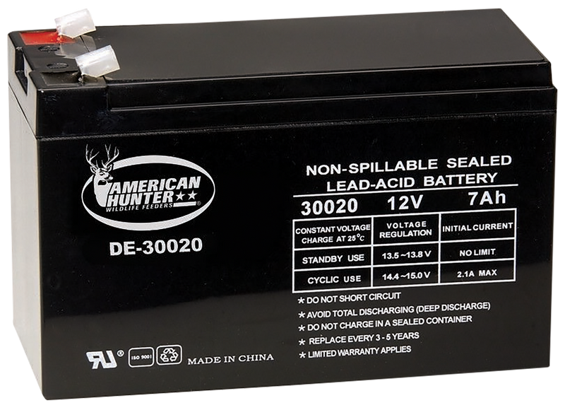 This 12-volt 7-amp sealed lead acid rechargeable battery is designed to power American Hunter game feeders and related outdoor equipment. The battery charges fully in 3 hours and features a tab-top connector configuration for reliable power delivery. Dimensions are 5.9" L x 3.7" W x 2.5" H.