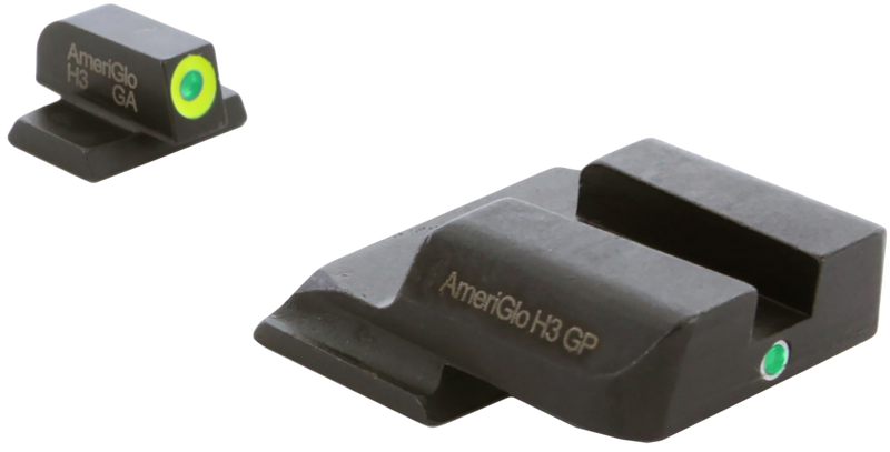 This AmeriGlo i-Dot night sight set is designed for Smith & Wesson M&P pistols and features green tritium front and rear sights with a LumiGreen outline on the front sight for enhanced low-light visibility. The sights have a fixed design with no windage or elevation adjustment and are constructed with steel frames and tritium materials for durability and reliable night shooting performance.
