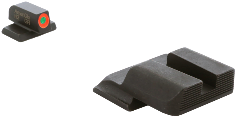 This front and rear sight set from AmeriGlo is specifically designed for Smith & Wesson M&P and M&P 2.0 pistols. The front sight features green tritium with an orange outline for visibility in low-light conditions, while the rear sight is black with serrated edges for reliable targeting. Both sights are constructed from steel with tritium illumination on the front element.