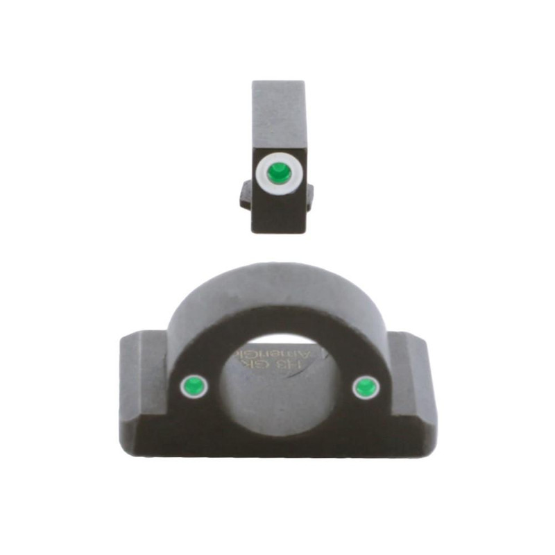 AmeriGlo Tritium Ghost Ring sight features an aperture-style rear sight with two tritium mini-dots (green) and a bright tritium front sight with white outline for immediate front sight acquisition in low-light conditions. The ghost ring design automatically centers the eye in the rear aperture while focusing on the front sight for faster target acquisition. Compatible with Glock 42, 43, 43X, and 48 models.