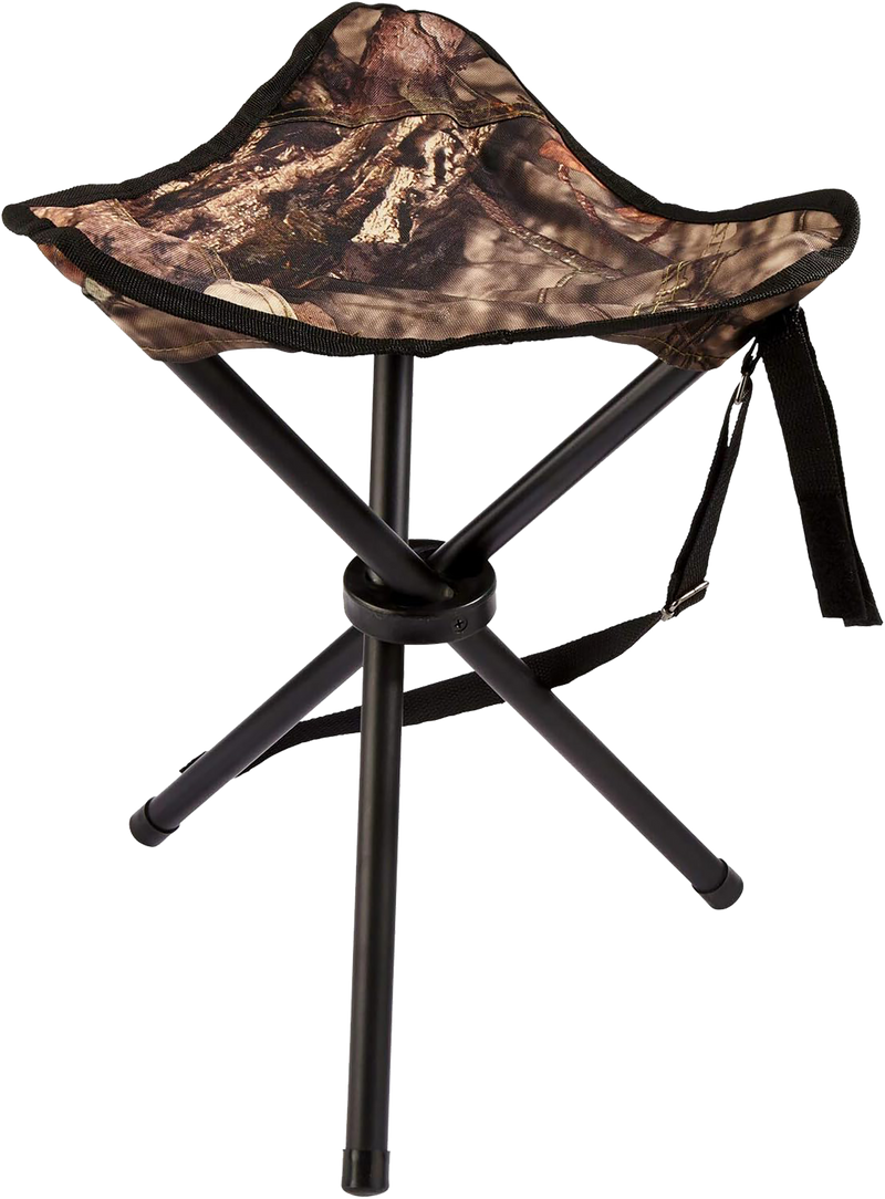 Heavy-duty tripod stool designed for hunters needing a portable, lightweight seating solution in the field. Features a durable fabric and steel construction with a Mossy Oak Break-Up Country camouflage finish. Compact dimensions (23.2" height, 3.1" width and depth) make it easy to transport to hunting locations.
