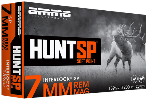 Ammo Inc Hunt ammunition in 270 Winchester with 140-grain soft point bullets and a muzzle velocity of 3030 fps. Features brass casings and comes in boxes of 20 rounds (10 boxes per case). Designed for hunting applications.