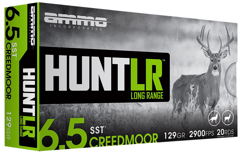 Ammo Inc Hunt Long Range ammunition in 6.5 Creedmoor with 129gr Super Shock Tip bullets loaded to 2900 fps muzzle velocity. Features precision performance-driven rounds with powders optimized for superior performance and consistent velocities across different temperatures and climates. Brass cases with Boxer primers, reloadable, manufactured in the USA.