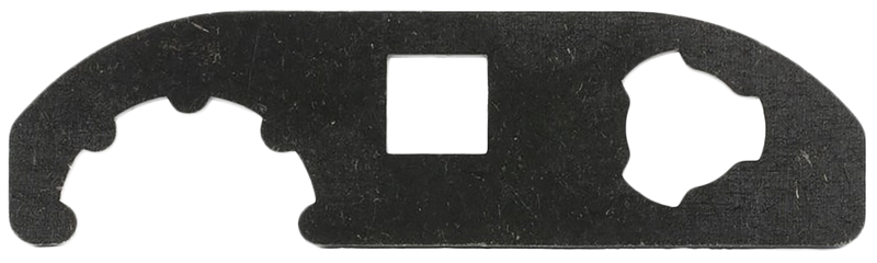 Two-sided wrench designed for installation and removal of 3-lug muzzle devices and complete disassembly of Angstadt Arms QD Blast Shield. Constructed from hardened steel with black nitride finish and features a 1/2" opening for socket wrench attachment. Compatible with 9mm 3-lug muzzle devices.