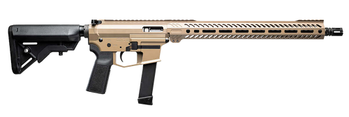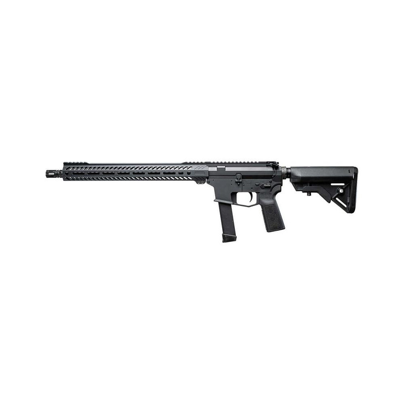 Semi-auto 9mm rifle with 16" threaded barrel and 15-round capacity using GLOCK magazines. Features billet aluminum 7075-T6 lower receiver, last round bolt hold open, flared magwell, and Picatinny rail for optics mounting.