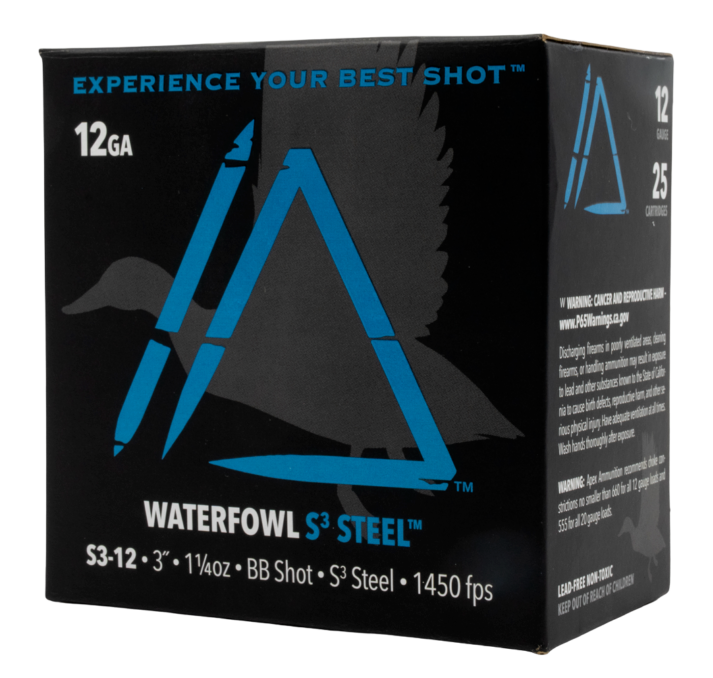 Apex Ammunition 12 Gauge 3" shotshell loaded with 1-1/4 ounces of BB shot. Steel casing construction suitable for waterfowl hunting and general shooting applications. Comes in a 250-round case (25 boxes of 10 rounds).