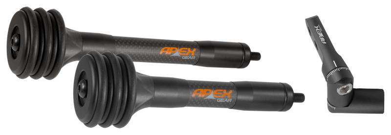 The Apex End Game Stabilizer Kit is designed for archery applications to enhance bow stability and accuracy. This kit includes stabilizer components that help reduce vibration and torque during the shot. Dimensions are approximately 15.3" x 8.9" x 2.5".