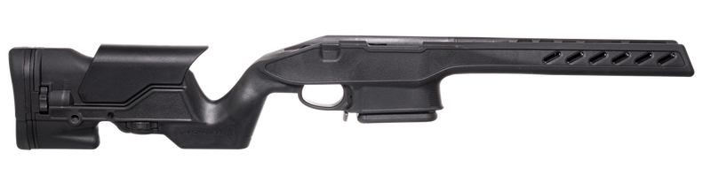 This is a black synthetic fixed stock designed for Remington 700 short action rifles, featuring an adjustable cheek riser for improved sight picture and ergonomics. Constructed from high-strength carbon fiber and glass-reinforced polymer, it includes an integral magwell for accepting double-column detachable magazines and two M-LOK accessory slots. The stock offers a gooseneck-style grip with palm swells, a ventilated forend, and a locking storage compartment, with a length of pull range of 13.50" to 14.60".