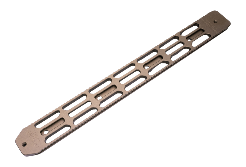 This is a 15.9" aluminum dovetail rail system designed for Barrett MRAD MK22 sniper rifles with M-LOK forends. It features serrated rail sides that mechanically lock with Area 419's proprietary clamp design to prevent movement. The rail is manufactured in the USA and is not compatible with older Barrett rifles equipped with circular holes.