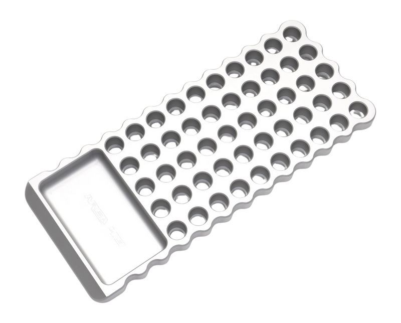 Machined aluminum billet loading block designed to safely hold up to 50 rounds of .308 Winchester, .308 Magnum, or Lapua bolt-faced cases during reloading. Features 0.500" deep holes with a tight fit to prevent case tipping, rubber pads on the bottom to prevent sliding, and clear anodized finish for durability. Dimensions are 9.5" x 4" x 5/8" and block is machined from 6061-T6 aluminum.