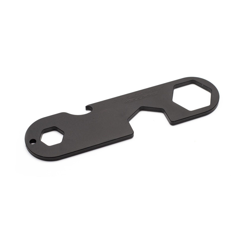 This machined aluminum wrench is designed for installation and maintenance of Area 419's Hellfire Modular Brake System components. It features multiple hex sizes (5/8" and 1-1/8") for tightening the Hellfire Universal Adapter and installing/removing Gen 2 Hellfire Suppressor Mounts, plus a bottle opener function. Constructed from solid 6061-T6 aluminum bar stock for durability.
