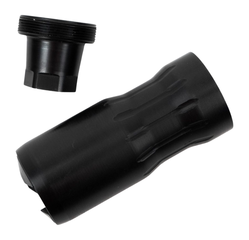 The Area 419 Hellfire Linear Flash Suppressor is a two-part muzzle device combining flash hiding and blast forwarding capabilities, designed for carbines, SBRs, and AR pistols. Constructed from 17-4 PH stainless steel with black nitride finish, it features a bore aperture suitable for calibers up to .458. The adapter threads feature 5/8-24 pitch and the components are permanently assembled.