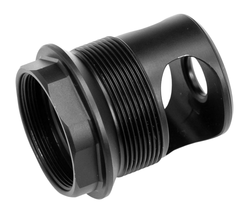 This is a suppressor mount adapter designed to allow compatible suppressors to work with the Sidewinder Self Timing Brake system. The adapter features black nitride finish to prevent galling and is manufactured to specifications for reliable performance. Installation involves removing the Sidewinder Brake and installing this mount in its place.