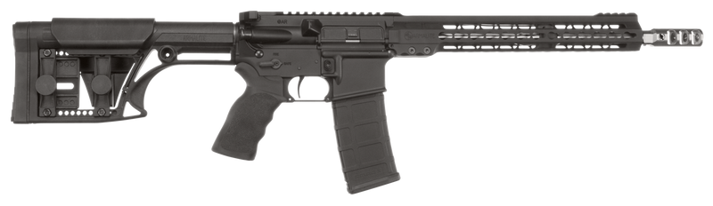 Semi-auto AR-15 rifle chambered in .223 Wylde with a 13.5" match grade stainless steel barrel and 30+1 capacity. Features an adjustable Luth-AR MBA-1 stock with cheek piece, tunable muzzle brake, adjustable gas block, and Picatinny rail for optics mounting. Weighs 6.9 lbs and is purpose-built for 3-gun and practical rifle competition.