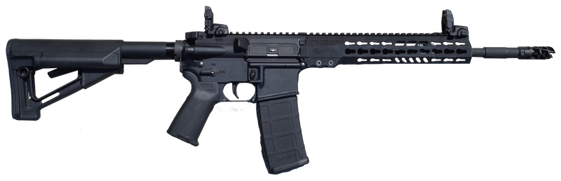 Semi-auto AR-15 platform rifle chambered in 5.56 NATO with a 14.5" pinned and welded chrome moly vanadium barrel and adjustable gas block. Features Magpul MBUS front and rear sights, full-length MIL-STD 1913 rail, Magpul STR collapsible stock, and ambidextrous safety. Weighs 6.8 lbs and ships with one 30-round magazine.