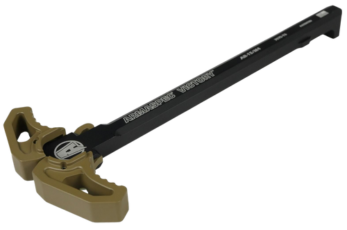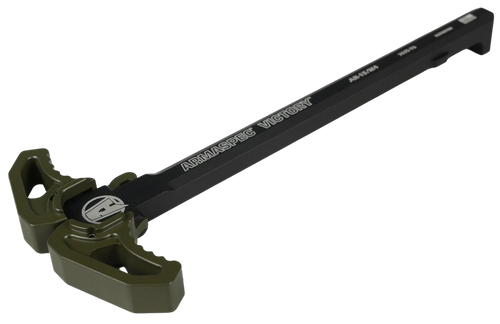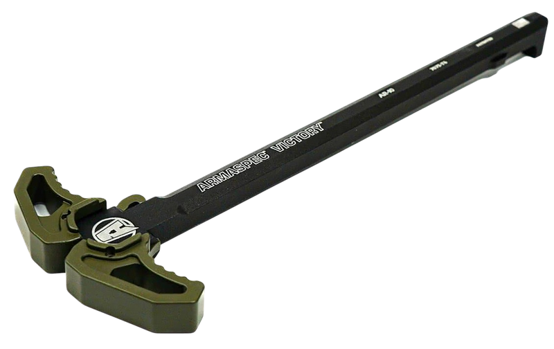 The Armaspec Victory charging handle is an ambidextrous aluminum charging handle designed for AR-10 and compatible platforms. Features OD green anodized finish with dimensions of 10.1" length, 3.7" width, and 0.5" height. The ambidextrous design allows operation from either side of the receiver without tools or modifications.