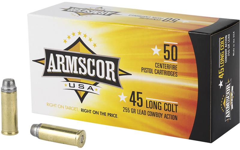 Armscor USA 45 Colt ammunition loaded with 255 grain lead round nose bullets at 800 fps muzzle velocity and 362 ft lbs muzzle energy. Features brass casings with Boxer primers and is reloadable. Packaged 50 rounds per box.