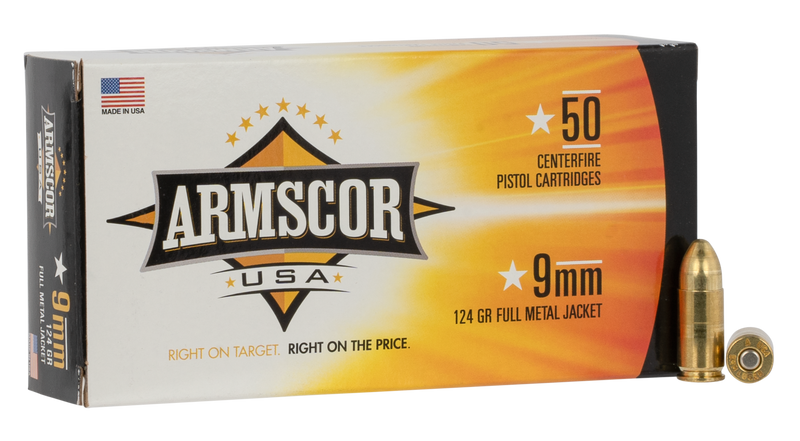 Armscor USA 9mm Luger ammunition loaded with 124 grain Full Metal Jacket bullets, producing 1092 fps muzzle velocity and 348 ft-lbs muzzle energy. Ideal for target shooting and competition use, this ammunition features brass casings with boxer primers and is reloadable. Packaged 50 rounds per box with 20 boxes per case.