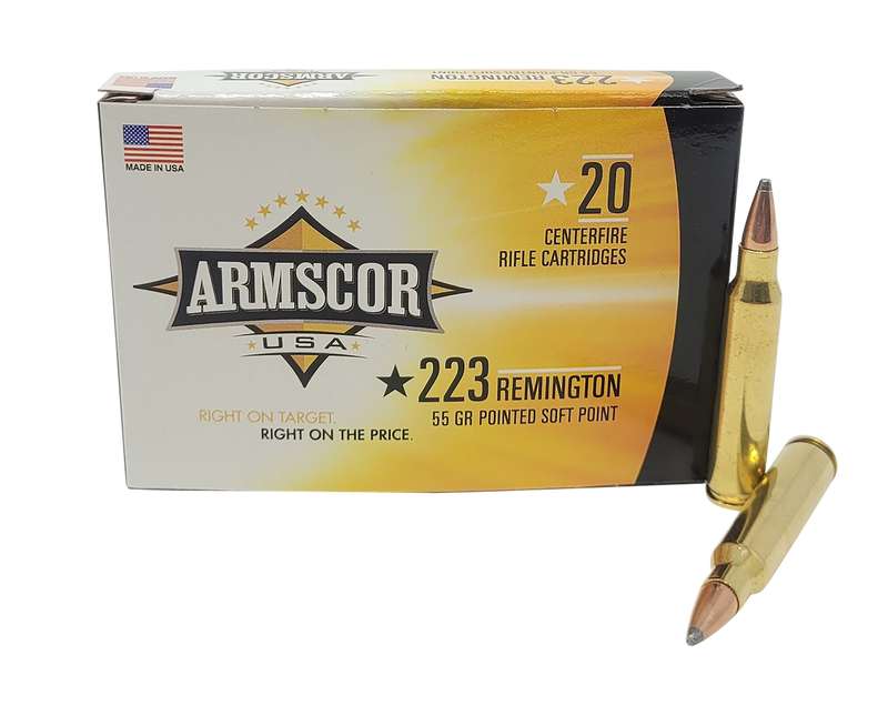 Armscor USA .223 Remington ammunition with 55-grain pointed soft point (PSP) bullets and brass casings. Delivers 3100 fps muzzle velocity and 1323 ft-lbs of energy, suitable for target shooting and hunting applications.