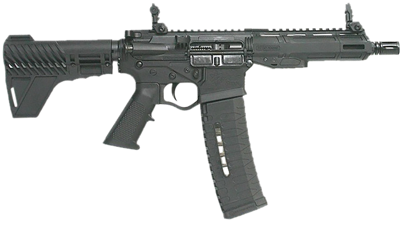 The ATI Alpha Maxx is a semi-automatic pistol chambered in 5.56 NATO with a 7.5" threaded barrel and 60+1 round capacity. It features a polymer M-LOK handguard, flip-up front and rear sights, and a polymer stock with integrated brace for enhanced stability. The compact AR-style platform weighs 6.95 lbs and measures 22" overall.