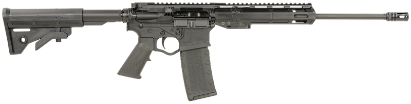 Semi-automatic AR-platform rifle chambered in 5.56 NATO with a 16" threaded barrel and 1:8 twist rate. Features a polymer receiver, 9" M-LOK handguard, flip-up front and rear sights, and ATI MM4 synthetic stock. Includes one 30-round magazine and weighs approximately 5.5-7.1 lbs.